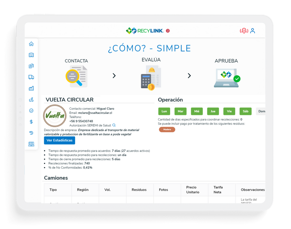 RECYLINK es una startup que ha desarrollado una plataforma digital para facilitar la gestión de residuos en las empresas. Consolida la información en un dashboard, conecta con transportistas dentro del marketplace de la plataforma, genera la trazabilidad de tus residuos, visualiza el impacto de tu gestión de residuos, monitorea los costos para que tomes acciones oportunas para mejorar tu gestión de residuos. Además detrás del uso de la plataforma hay un equipo humano especializado en gestión de residuos, apoyando en el monitoreo, cumplimiento de objetivos operacionales, medioambientales y legales para que tu gestión de residuos sea confiable, dentro de la norma y sea referente en tu industria.